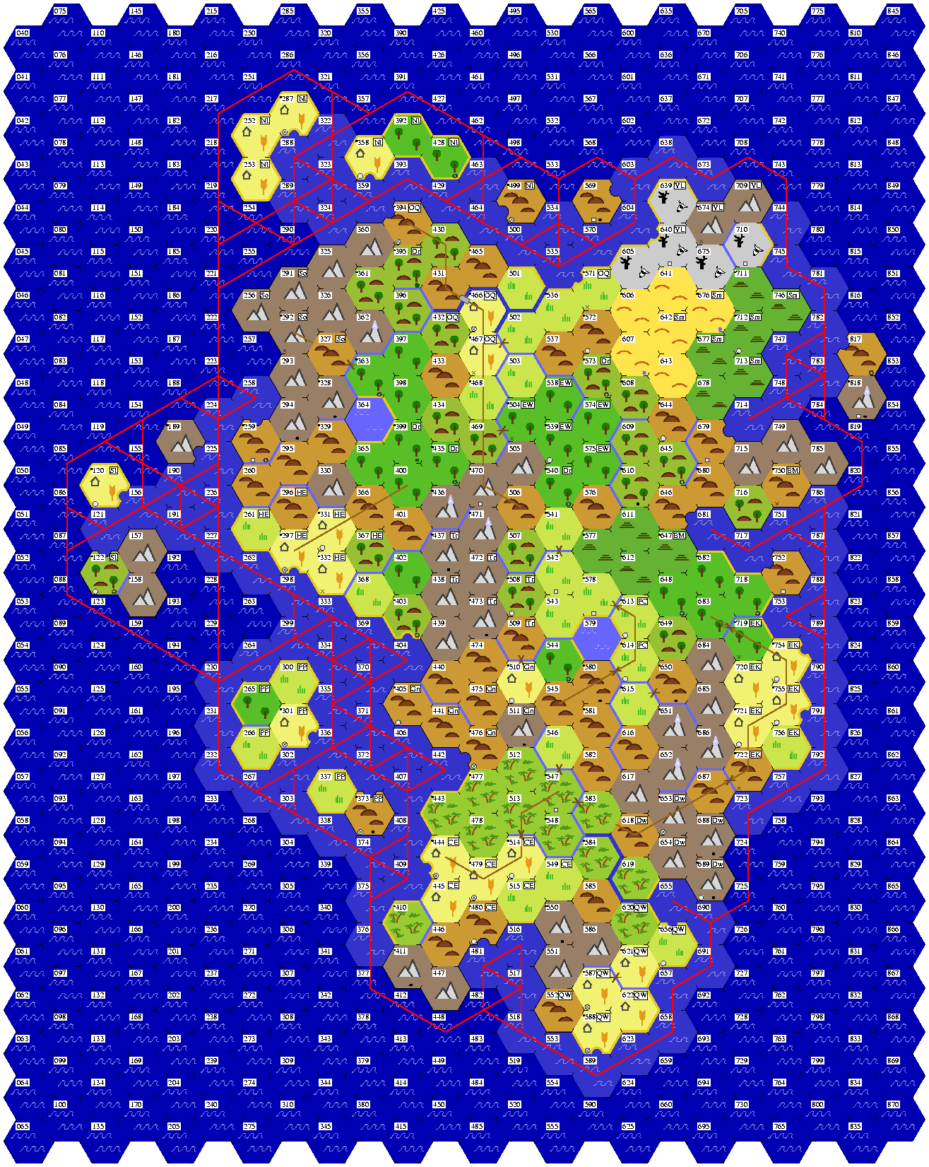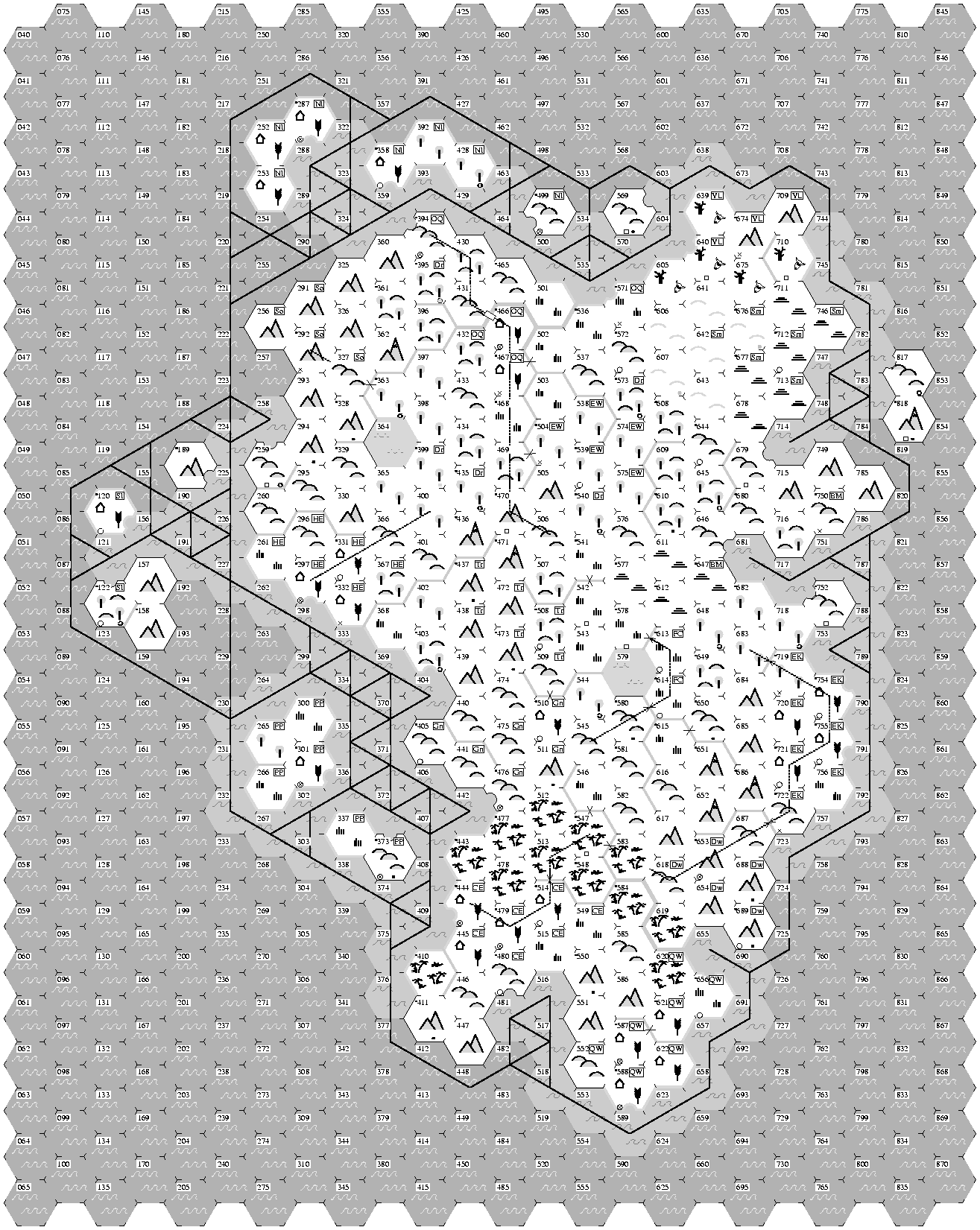 You can download a typical world map for "War of the Dark God". The map shows what the world typically looks like at the start of the game, although the actual game world may differ a little from game to game. The map notes list all the units and locations typically found at the start of the game (except those in quest mode). The exact composition and position of monster forces may differ from game to game, and you should be aware that most monster units moves around in a repeating pattern (which also may vary from game to game). Likewise the positions of mines and similar locations may change from game to game.
